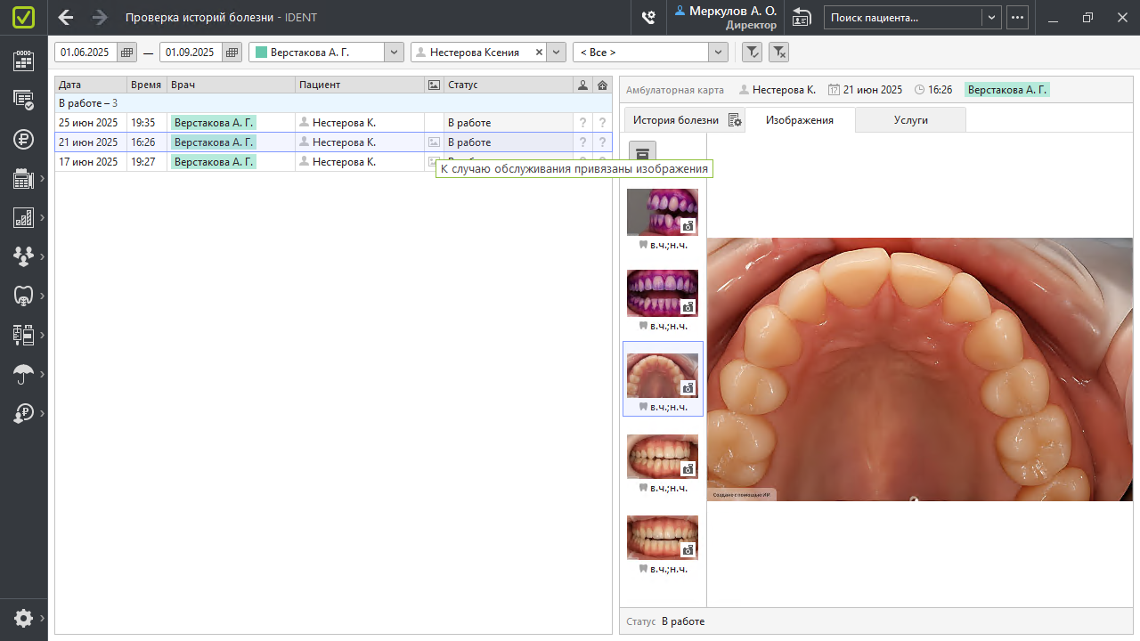 При проверке историй болезни главный врач увидит, добавляют ли врачи фотопротоколы, как этого требуют стандарты клиники. Можно посмотреть фото и рентген-снимки по конкретному приему и оценить, правильно ли врач выбрал лечение и насколько качественно его провел, а после — провести разбор случаев с командой.
