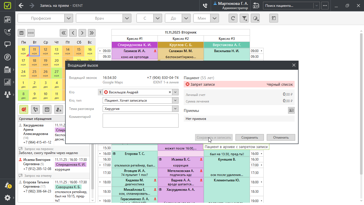 Теперь при записи на прием, обработке обращений или в процессе работы с карточкой пациента IDENT подскажет, если пациент находится в архиве или имеет запрет записи.
