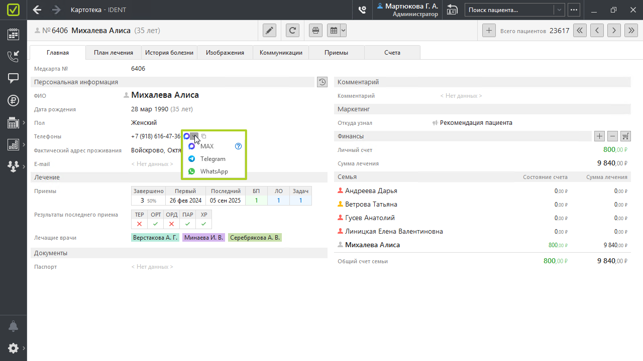 Так администратор может сразу начать общение, не тратя время на поиск мессенджера. Вся коммуникация начинается прямо из карточки пациента — в привычном рабочем процессе.
